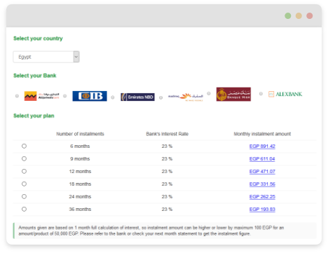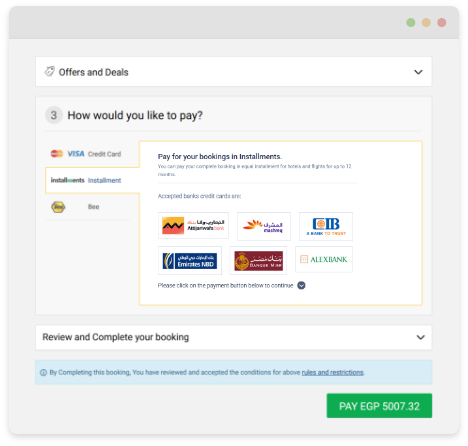 let's get startedAfter choosing your trip and deliver the payment page, simply choose INSTALLMENTS then choose your bank and your suitable method (make sure that you have read the terms and conditions)